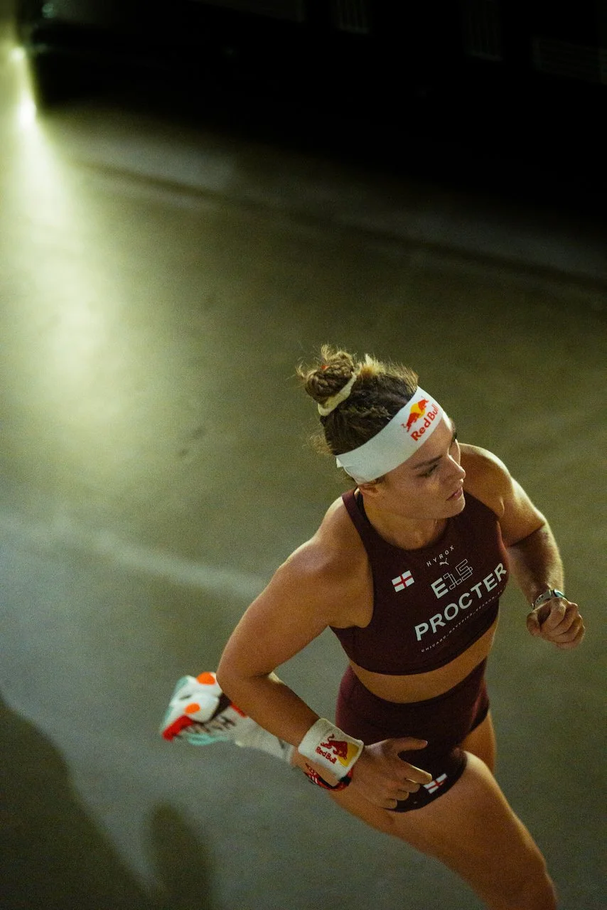 I found an interesting stairwell in the venue that I was able to shoot from. It was a pretty interesting vantage point for some of the running. I had several images that I liked but this one of Lucy Procter stood out the most because of her posture and the flash of light in that moment.